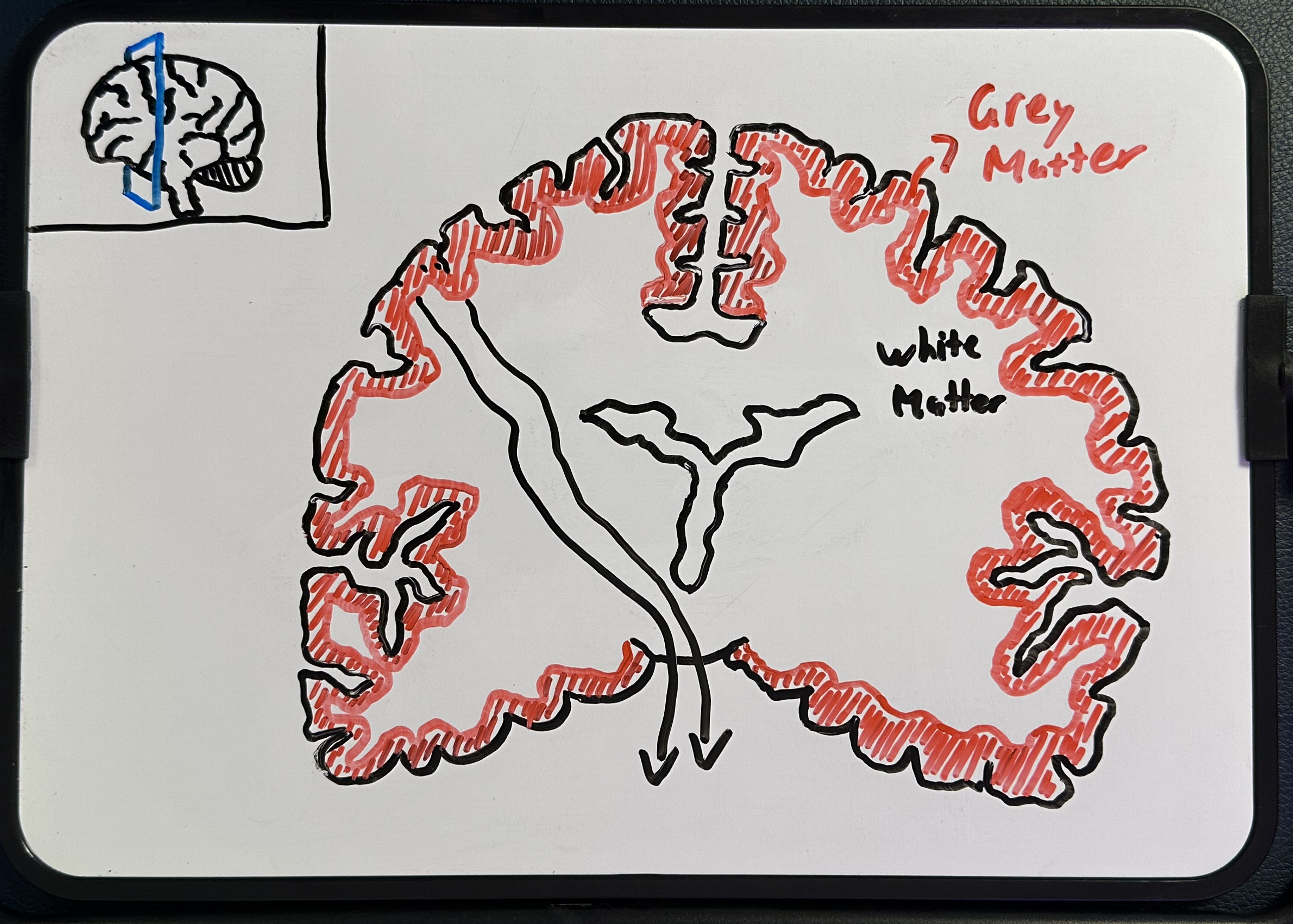 For now, a key concept is that the outermost layer of the brain, called the cortex, is where most signal processing and generation takes place. The cortex is dense with neuron cell bodies and dendrites, giving it a darker colour — which is where the term "grey matter" comes from. Deeper structures, by contrast, are rich in myelinated axons carrying signals to and from the cortex, and their lighter colour gives them the name "white matter".